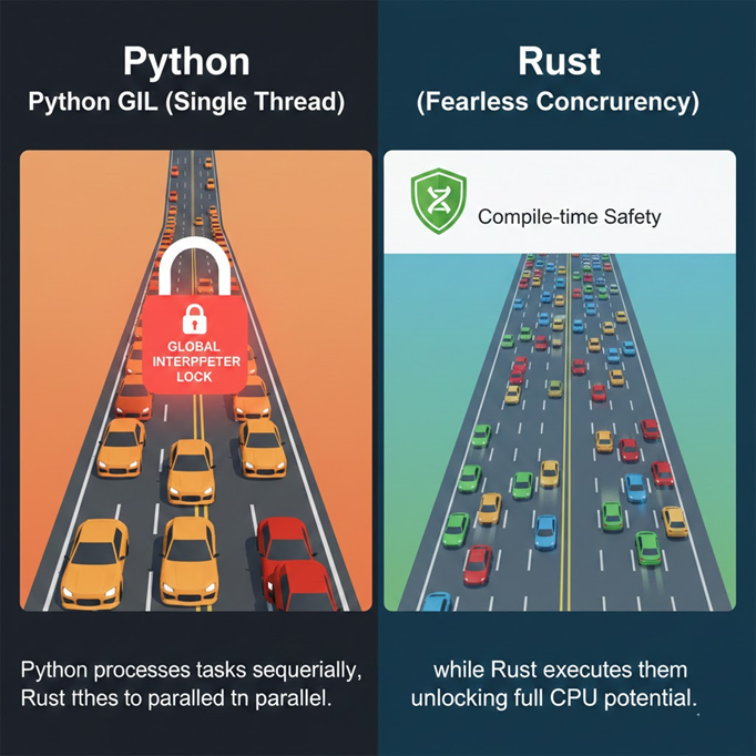 | Concurrency | Limited by GIL | “Fearless” (Native Threading) |